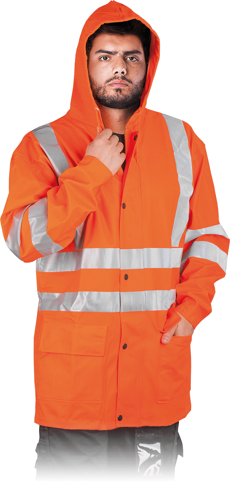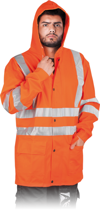 Pracovní pláštěnka FEUER je ideálním oděvem do deštivého počasí. Je ze 100%-ního PES materiálu z polyuretanovým povlakem. Má podlepené švy, které zabraňují vodě přejít pod látku. Speciální střih na zadní straně zajišťuje proudění vzduchu bez rizika vniknutí vody. Bunda je v souladu s normami EN471, EN343 a EN340. Pracovní komplet do deště TERO ORANGE ve výrazné oranžové barvě je z větší části polyuretanový s polyesterovými vlákny. Díky vysoké kvalitě, pružnosti a pevnosti je tento set odolný vůči oděru či roztrhání. Dostatečnou prodyšnost zajišťuje ventilace na zádech a v podpaží. Kapuci zabudovanou v límci lze stáhnout v případě větrného počasí. Na ideální šířku lze stáhnout také rukávy, pas či kalhoty v oblasti kotníků.